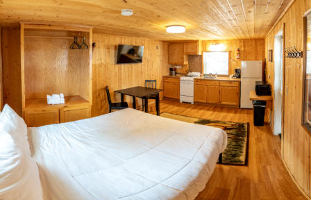 area’s heritage. Each cabin features comfortable, updated interiors with a mix of queen and twin